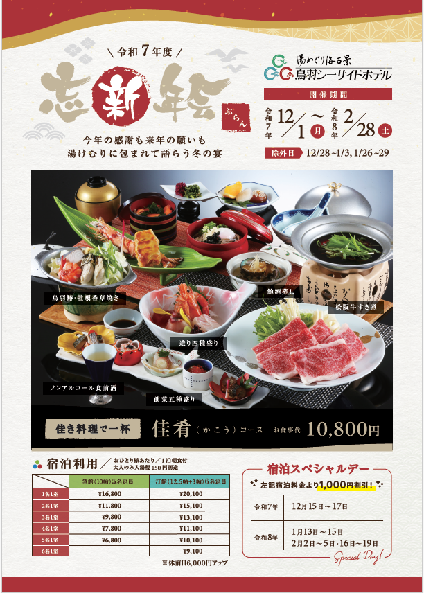 贅沢な食材をふんだんに使った「忘新年会プラン」で心温まるひとときを。