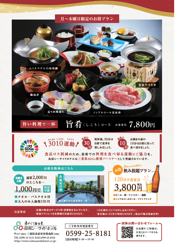 ご予約専用電話番号 0599-25-8181(受付時間 9:00~19:00)まで